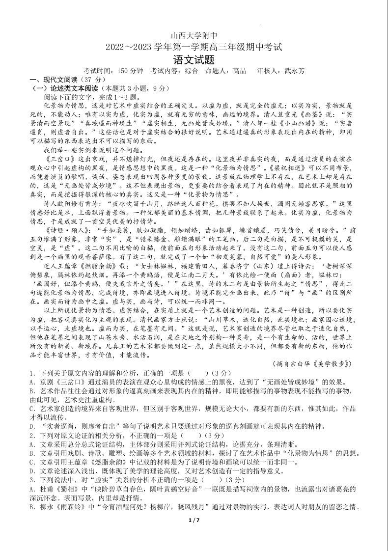 高三语文--山西大学附属中学校2023届高三上学期11月期中