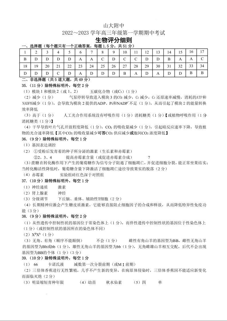 高三生物答案--山西大学附属中学校2023届高三上学期11月期中