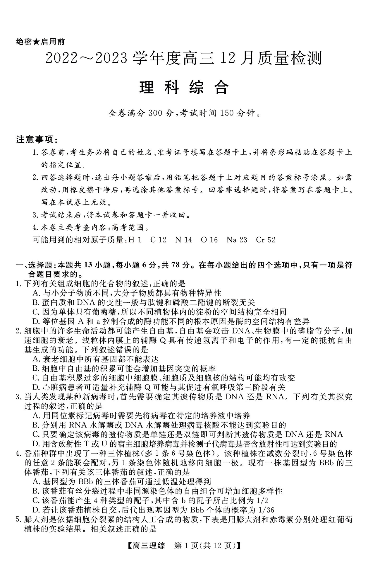 高三理综--金科大联考2023届12月质量监测