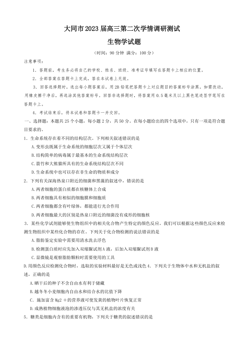 高三生物+答案--山西省大同市高三上学期第二次学情调研测试(期中)
