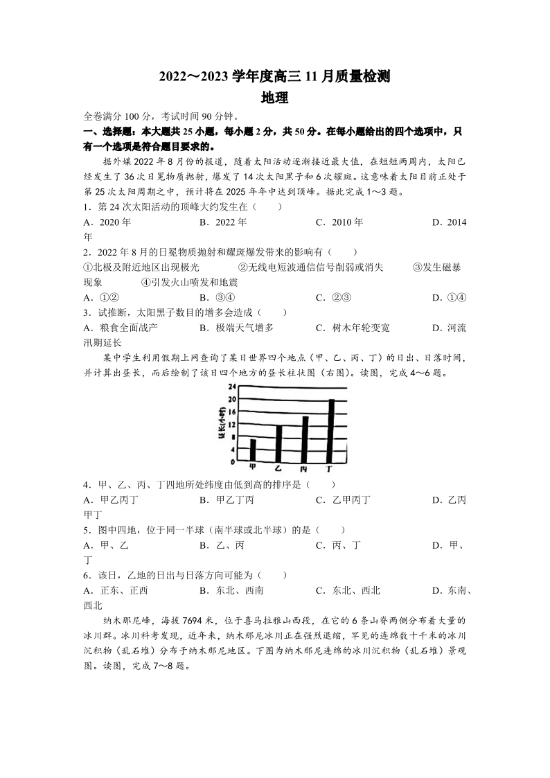 高三地理+答案--山西省金科大联考2022-2023学年高三上学期11月质量检测