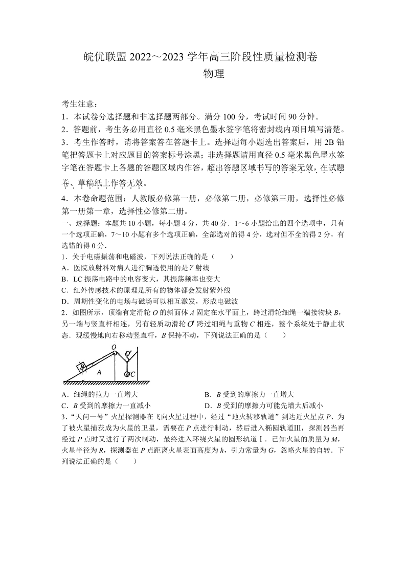 高三物理+答案--皖优名校联盟2022-2023高三阶段12月质量检测卷