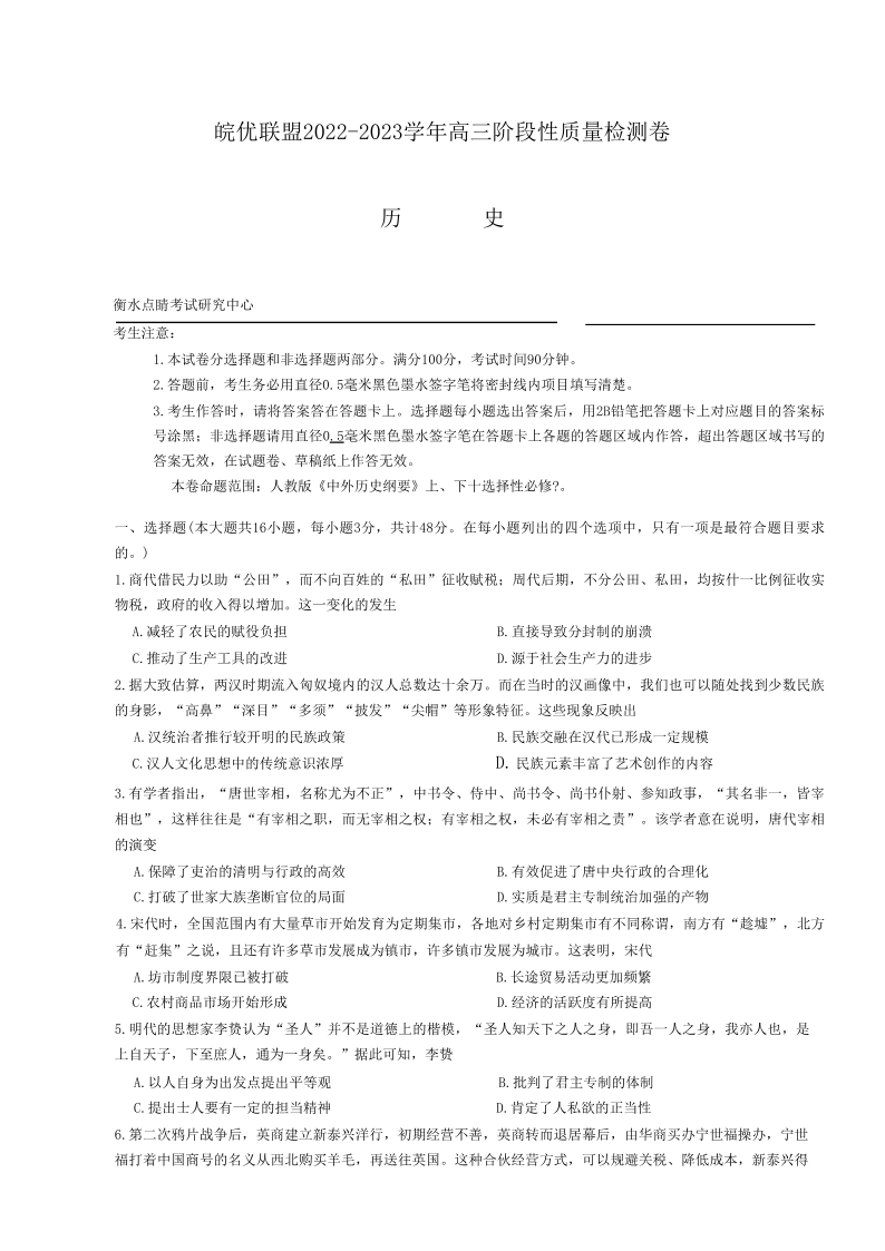 高三历史+答案--皖优名校联盟2022-2023高三阶段12月质量检测卷