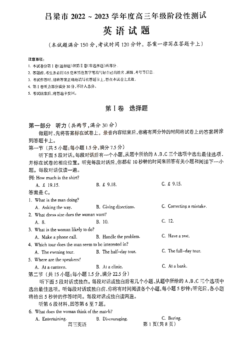 高三英语+答案--山西省吕梁市2022-2023学年高三11月阶段性测试
