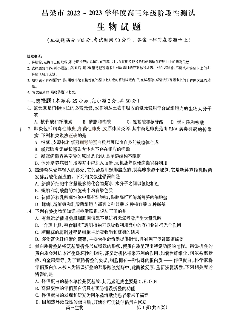 高三生物+答案--山西省吕梁市2022-2023学年高三11月阶段性测试