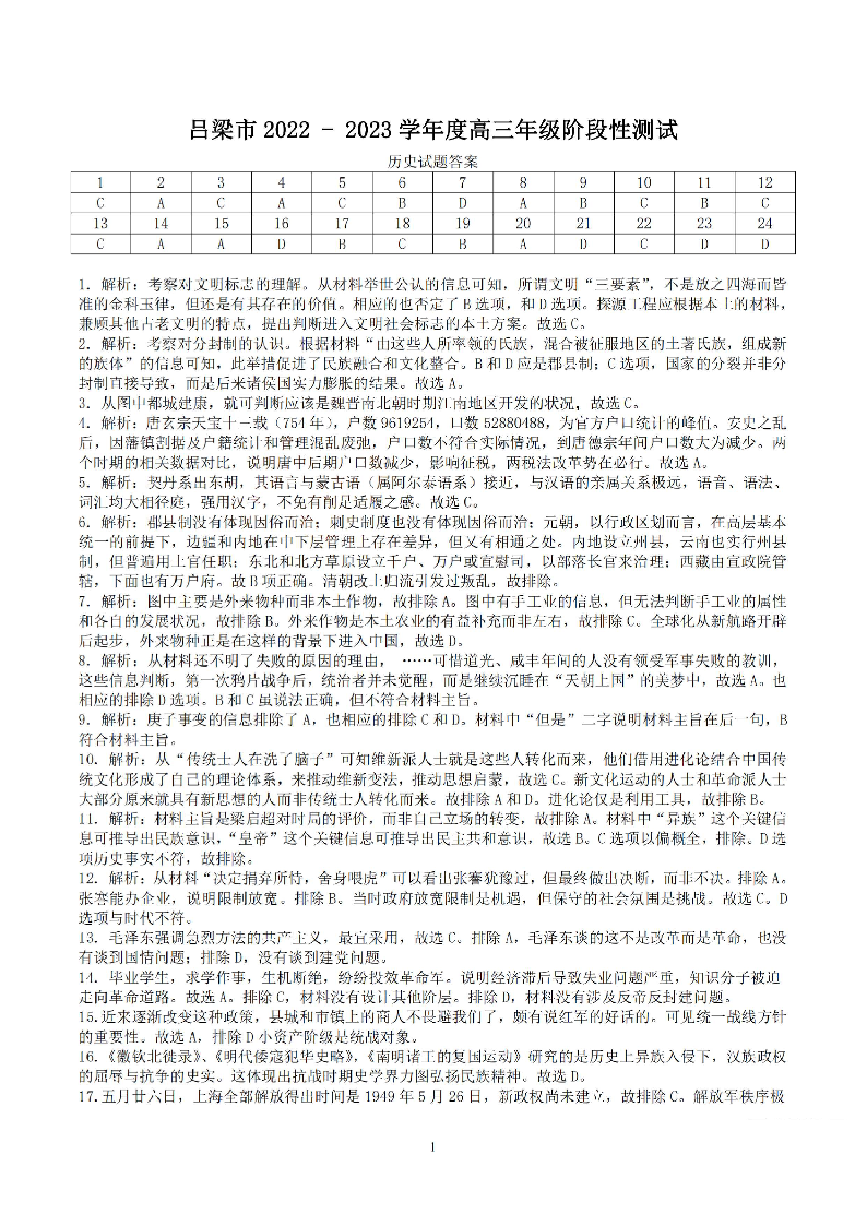 高三历史答案--山西省吕梁市2022-2023学年高三11月阶段性测试