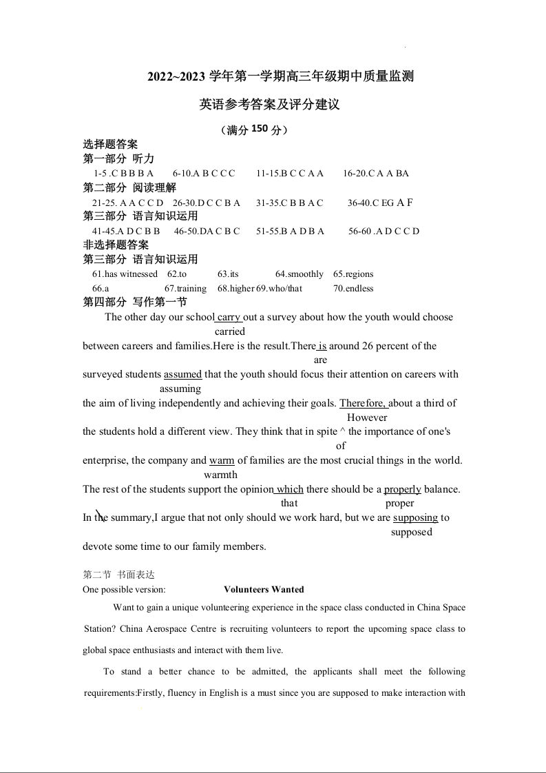 高三英语答案--山西省太原市高三上学期期中质量监测
