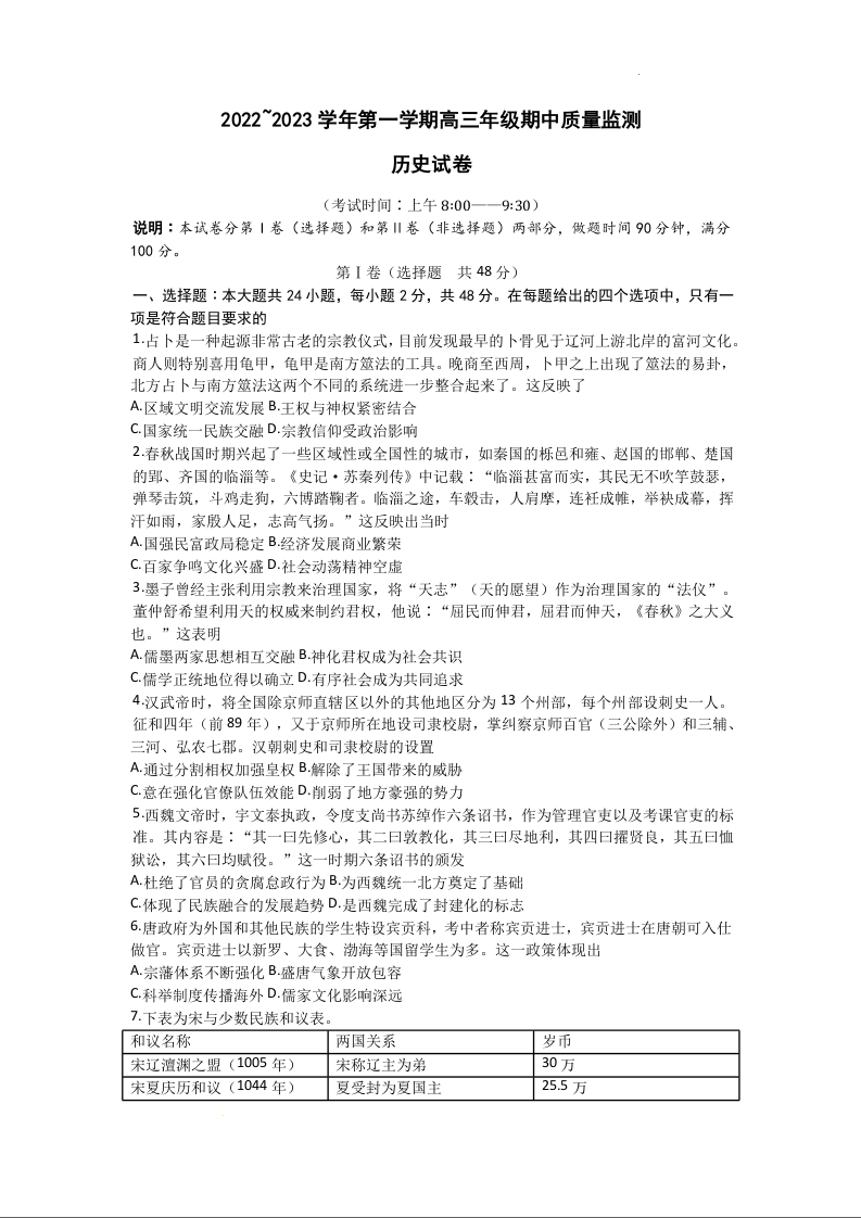 高三历史+答案--山西省太原市高三上学期期中质量监测