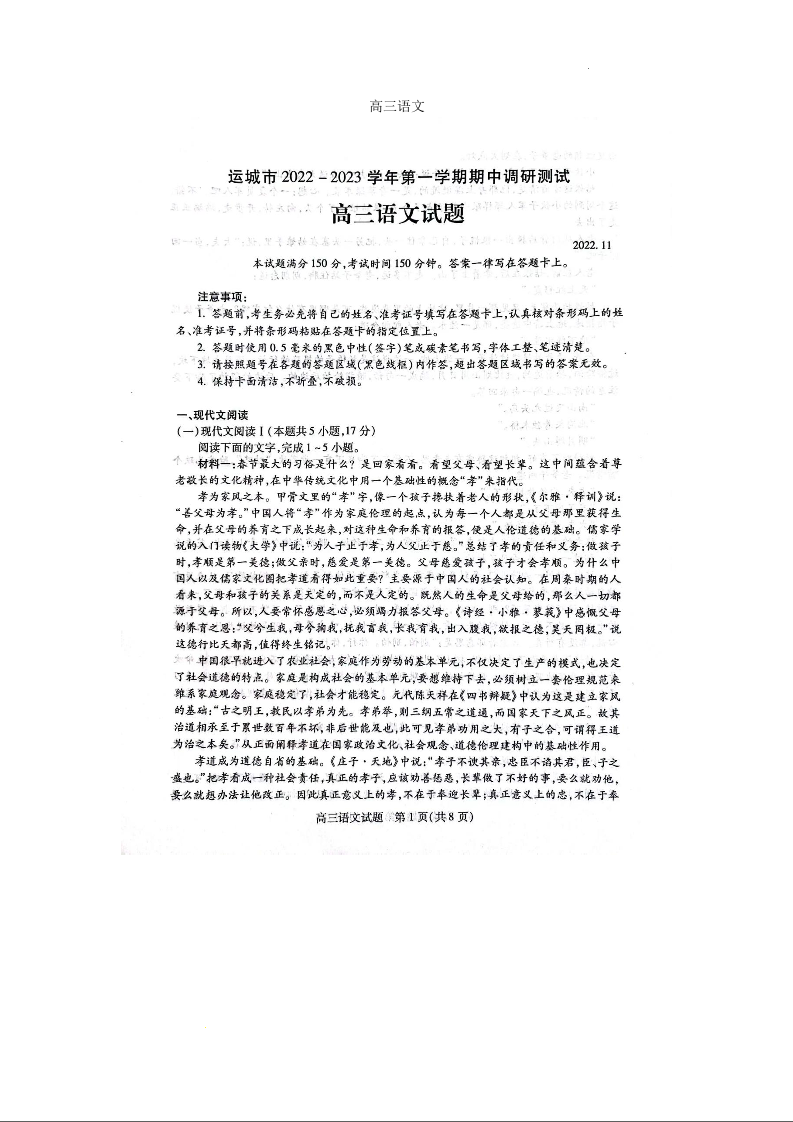 高三语文--山西省运城市2023届高三上学期11月期中调研测试