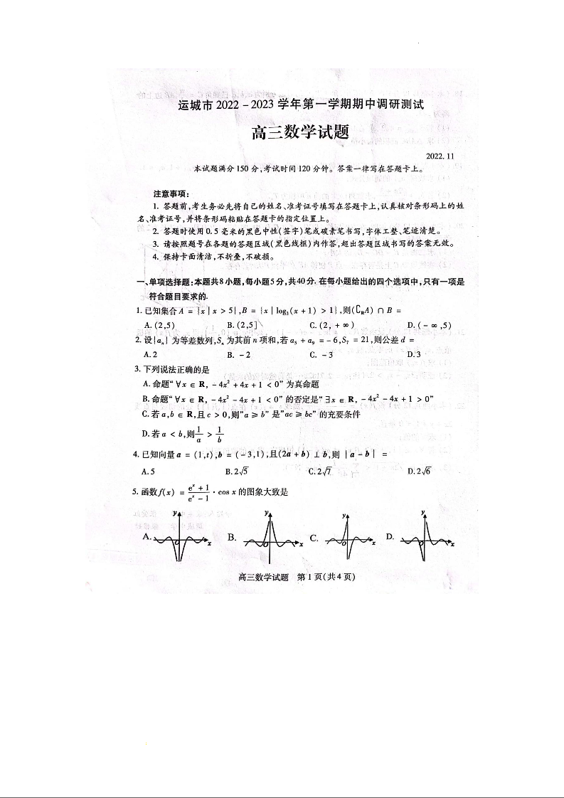 高三数学--山西省运城市2023届高三上学期11月期中调研测试
