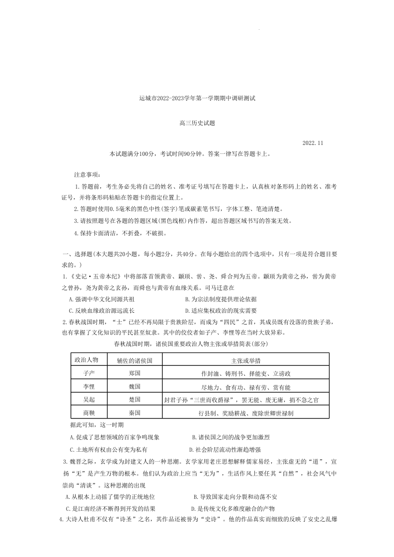 高三历史+答案--山西省运城市2023届高三上学期11月期中调研测试