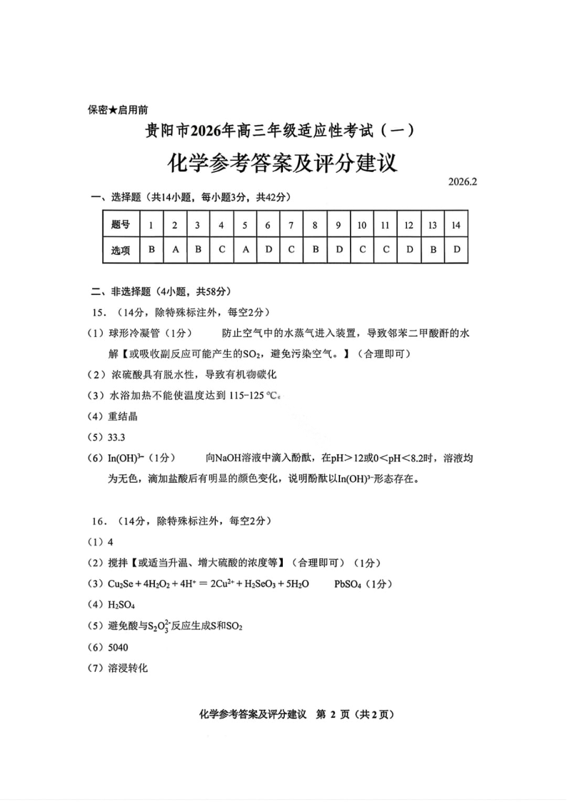 高三化学答案--贵州省贵阳市2026年高三年级2月适应性考试(一)