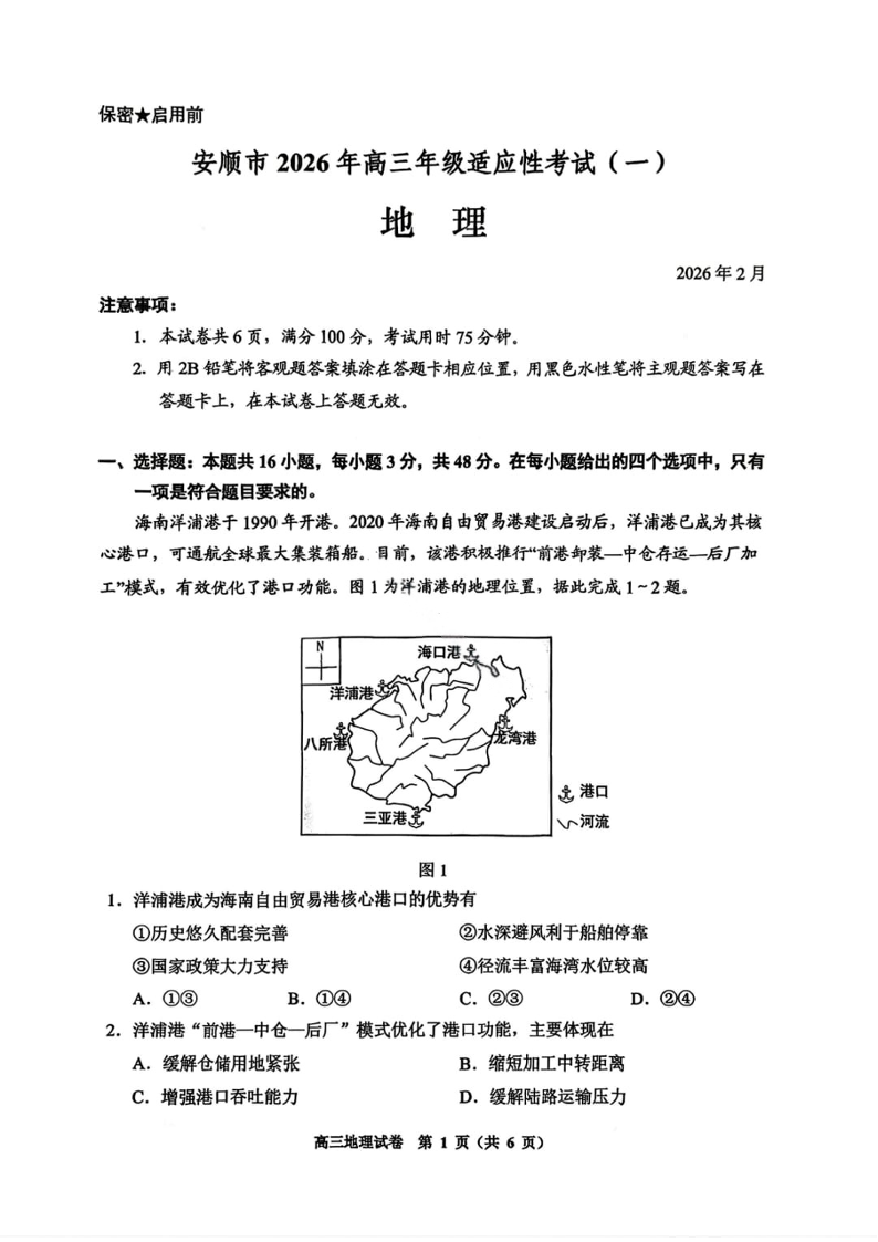 高三地理--贵州省贵阳市2026年高三年级2月适应性考试(一)