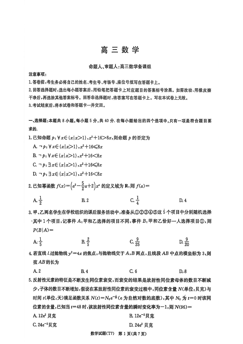 高三数学+答案--湖南师大附中2026届高三2月月考试卷(七)