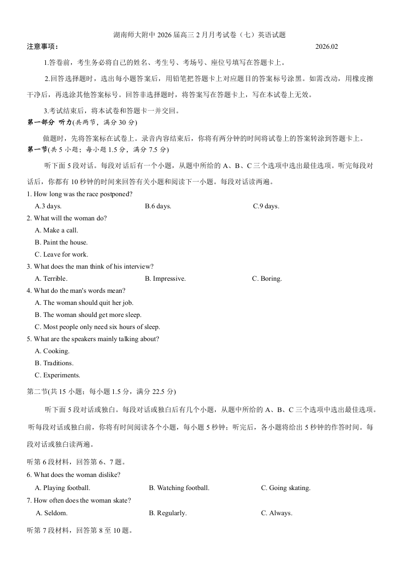 高三英语+答案--湖南师大附中2026届高三2月月考试卷(七)