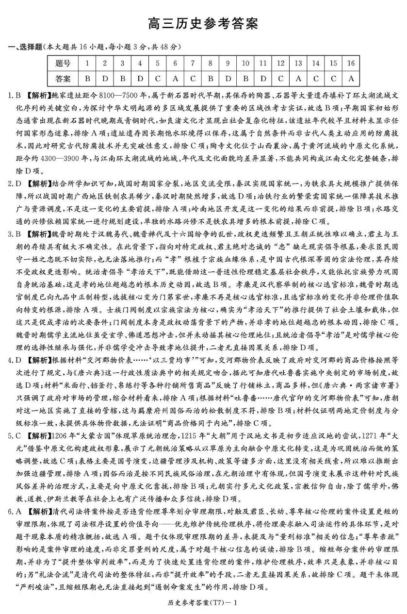 高三历史答案--湖南师大附中2026届高三2月月考试卷(七)