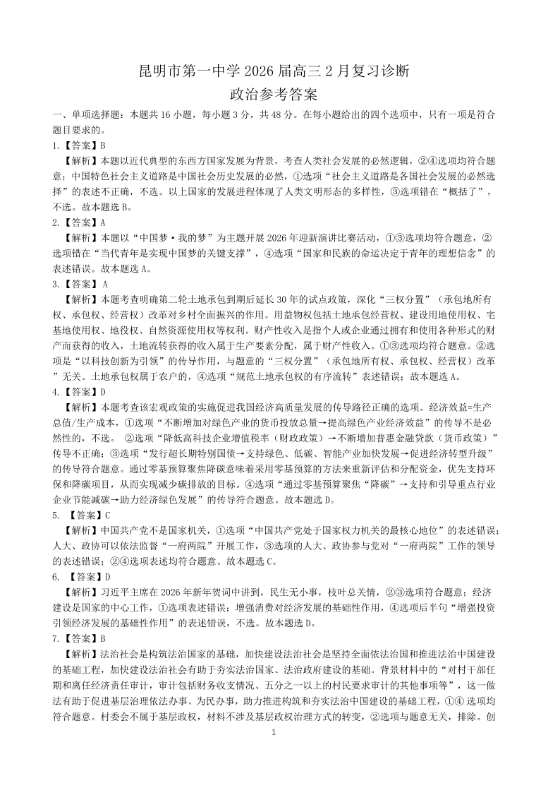 高三政治答案--云南省昆明市第一中学2026届高三2月复习诊断