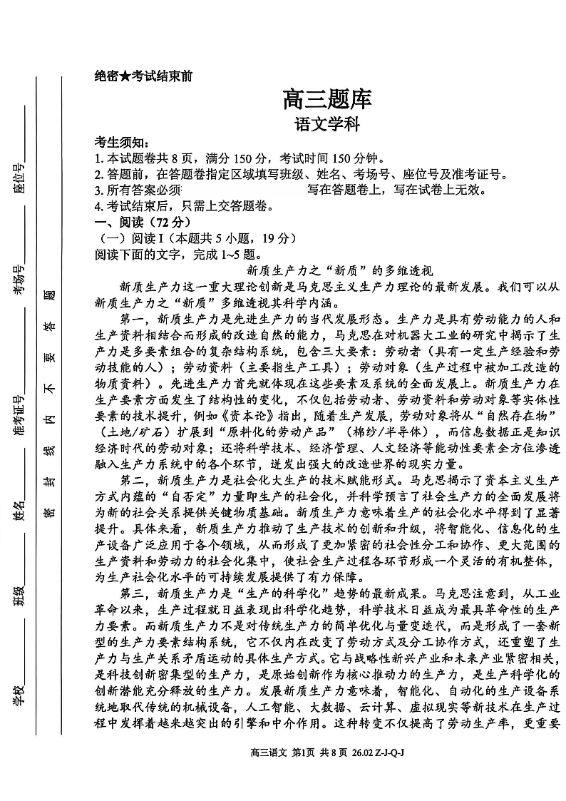 高三语文--浙江省2026届高三2月返校考七彩阳光、浙南名校、精诚联盟、金兰教育