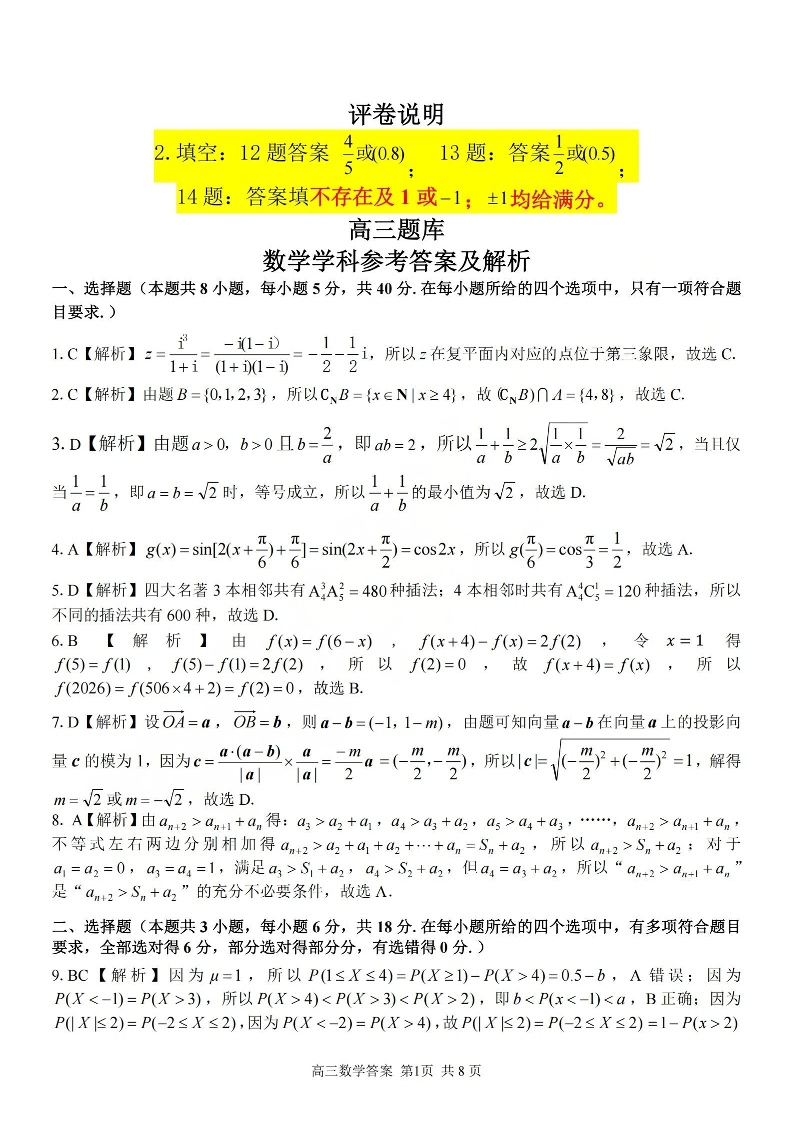 高三数学答案--浙江省2026届高三2月返校考七彩阳光、浙南名校、精诚联盟、金兰教育