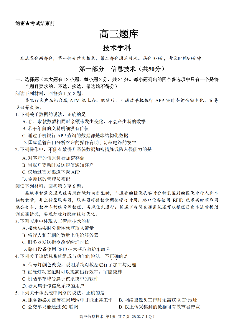 高三技术--浙江省2026届高三2月返校考七彩阳光、浙南名校、精诚联盟、金兰教育