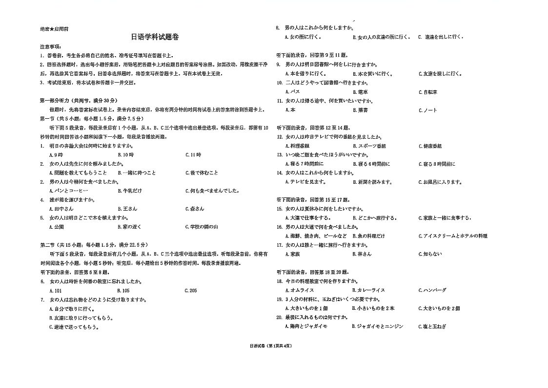高三日语--湖北省新八校2026届高三下学期2月开学考试