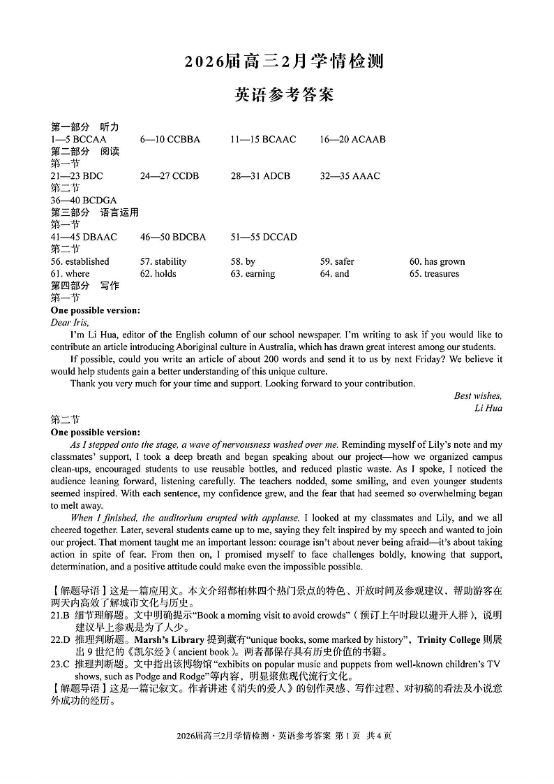 高三英语答案--安徽省A10联盟2026届高三2月开年考