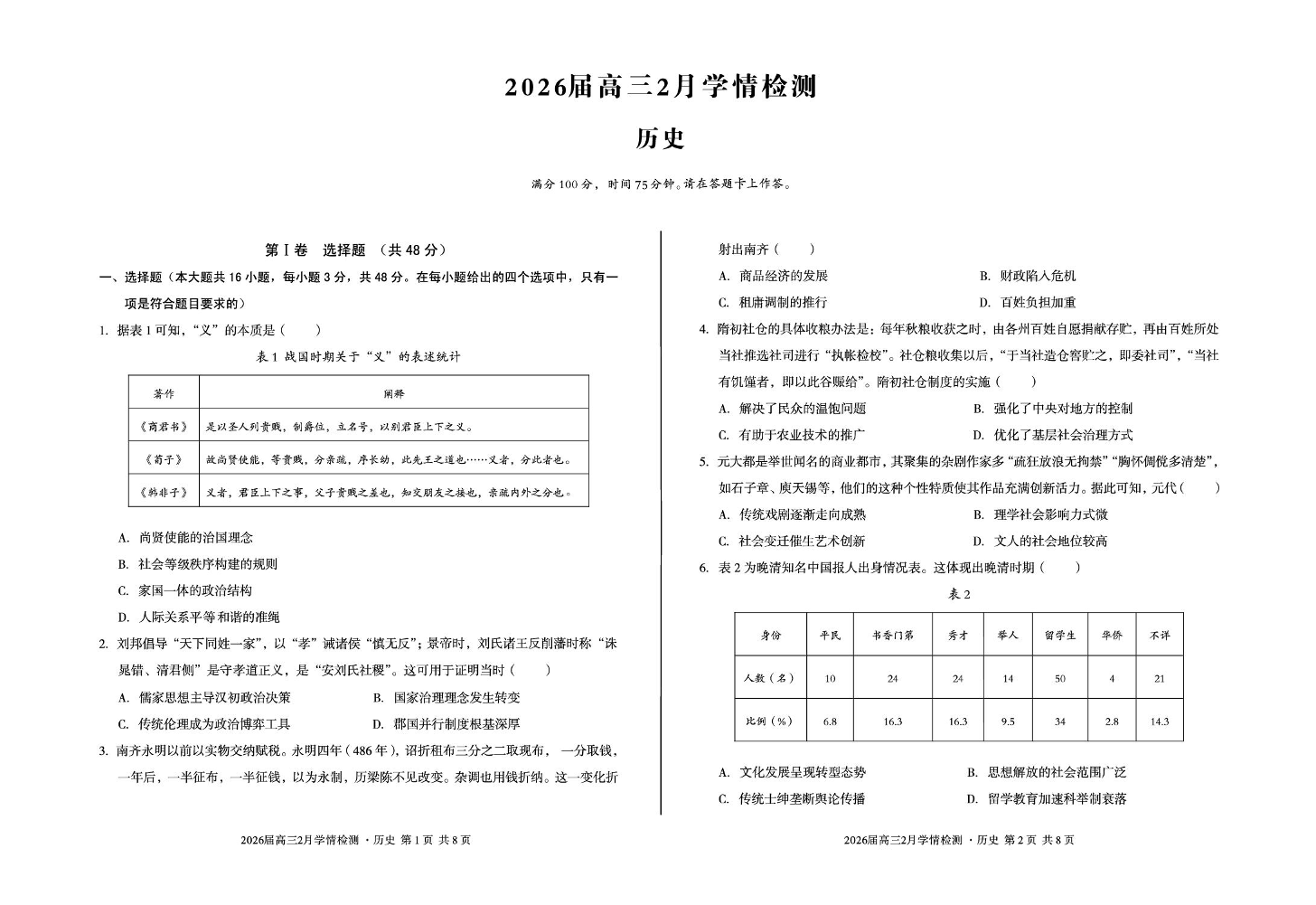 高三历史--安徽省A10联盟2026届高三2月开年考
