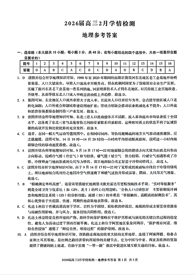 高三地理答案--安徽省A10联盟2026届高三2月开年考