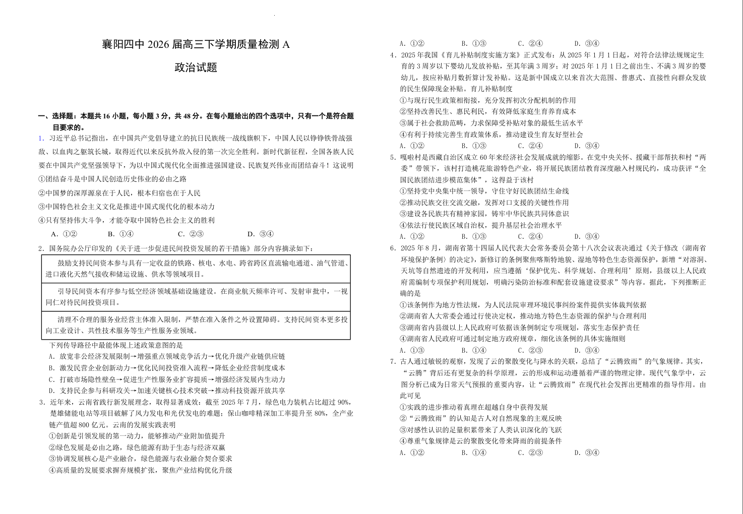 高三政治+答案--湖北省襄阳四中2026届高三下学期2月质量检测