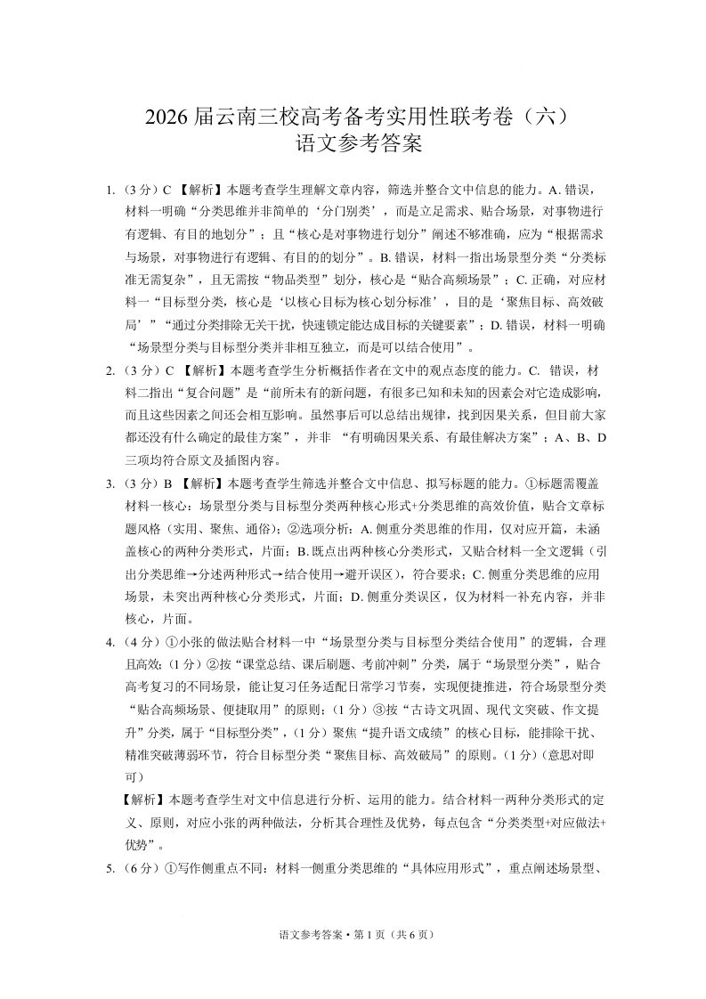 高三语文答案---云南2026届三校高考备考实用性联考卷(六)