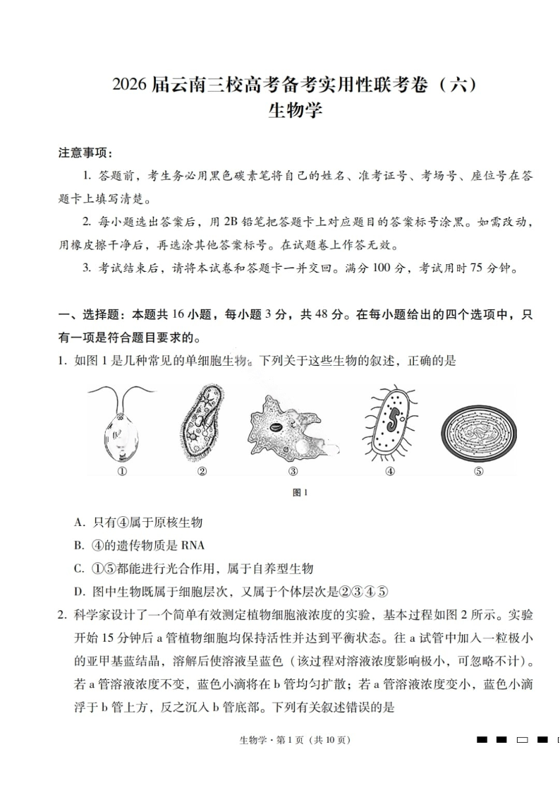 高三生物---云南2026届三校高考备考实用性联考卷(六)