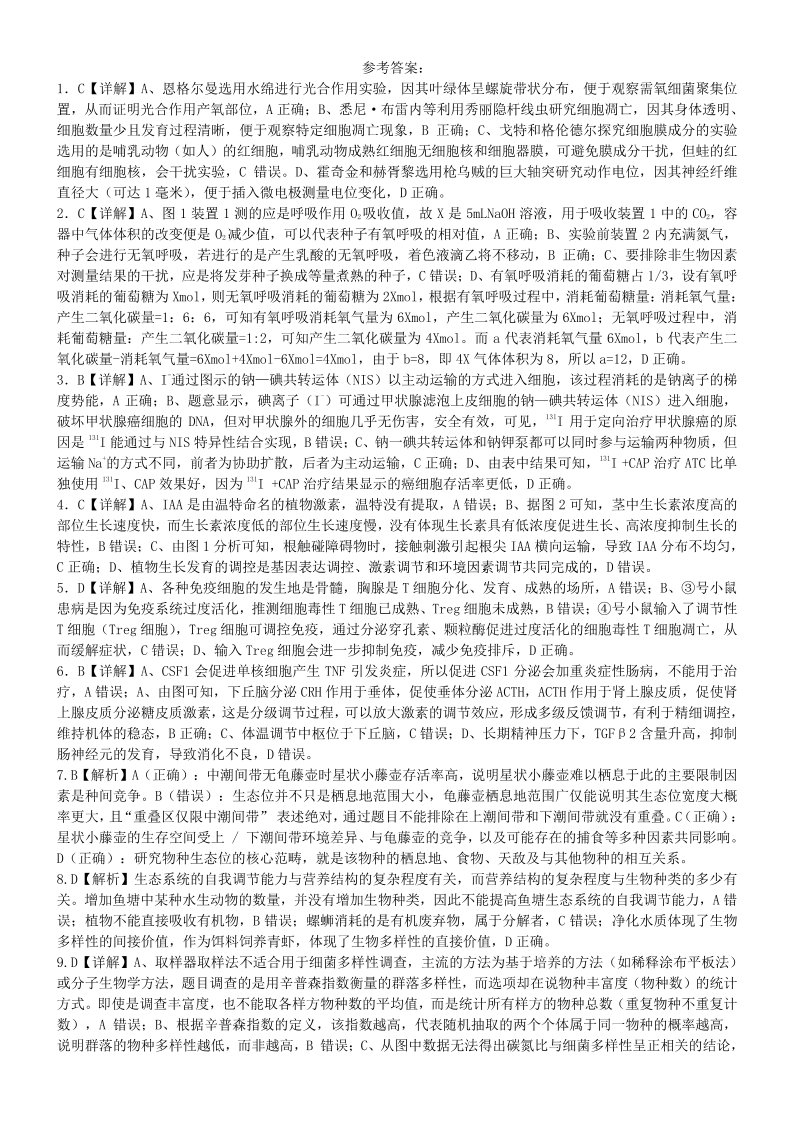 高三生物答案--重庆市第八中学2026届高三下学期入学考试