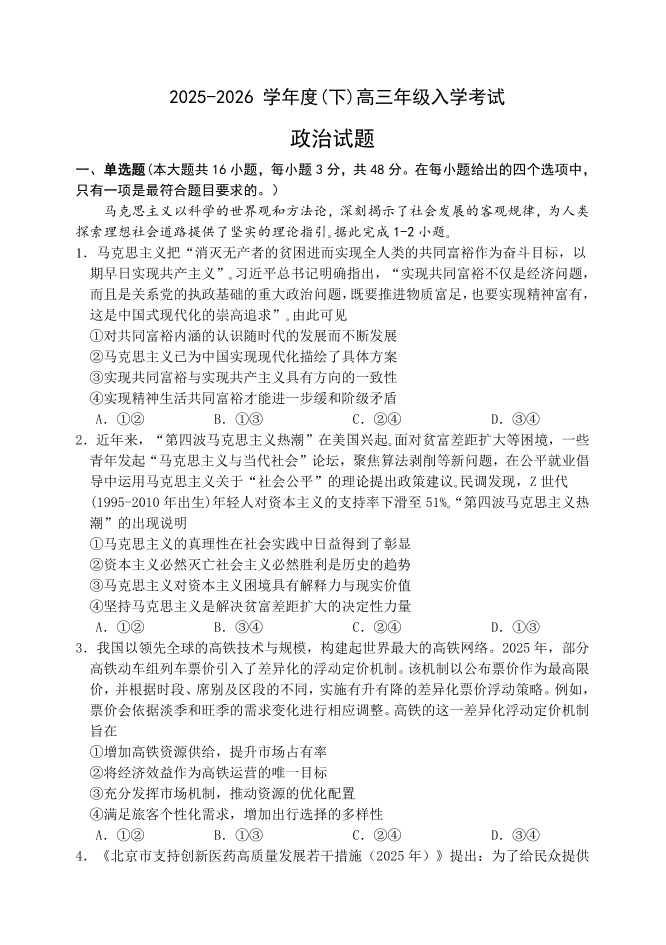 高三政治--重庆市第八中学2026届高三下学期入学考试
