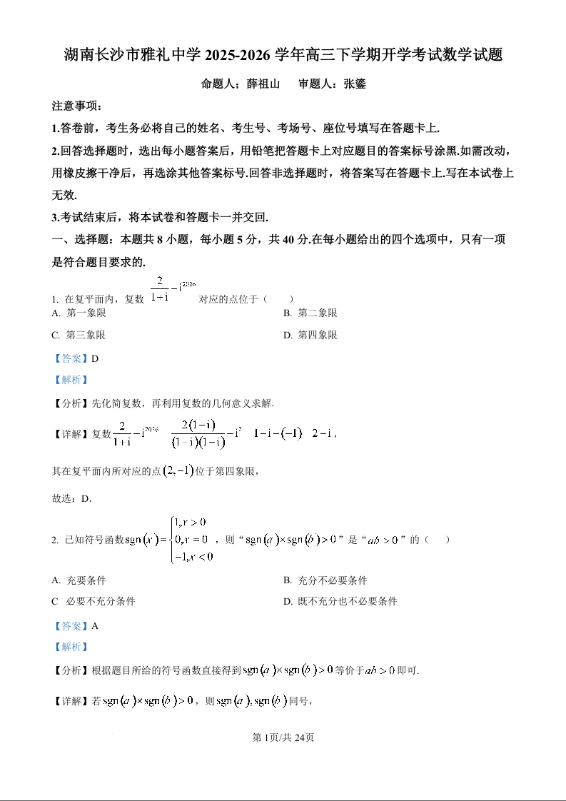 高三数学(精品解析版)--湖南长沙市雅礼中学2026届高三下学期开学考试