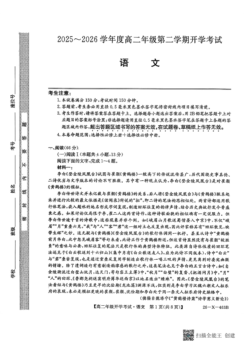 高二语文--黑龙江省龙东十校联盟2025-2026学年高二开学考试