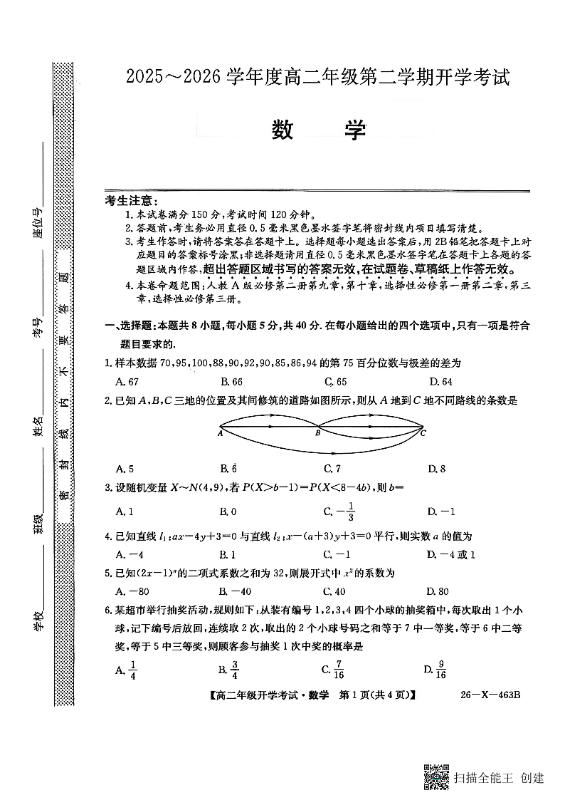 高二数学--黑龙江省龙东十校联盟2025-2026学年高二开学考试