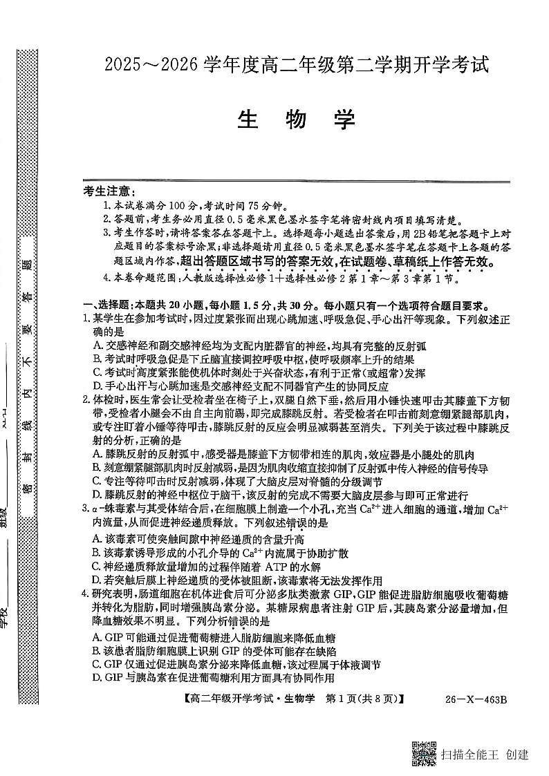 高二生物--黑龙江省龙东十校联盟2025-2026学年高二开学考试