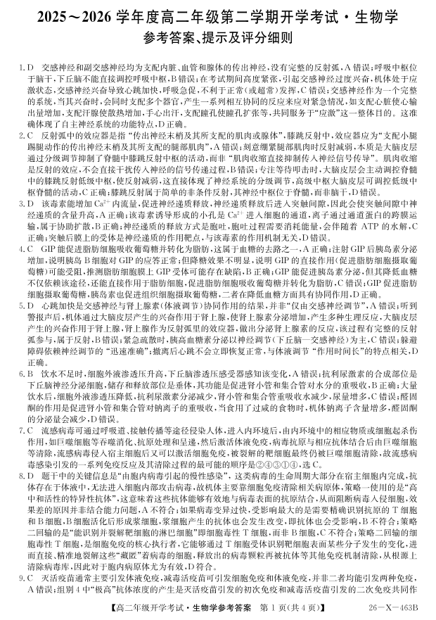高二生物答案--黑龙江省龙东十校联盟2025-2026学年高二开学考试