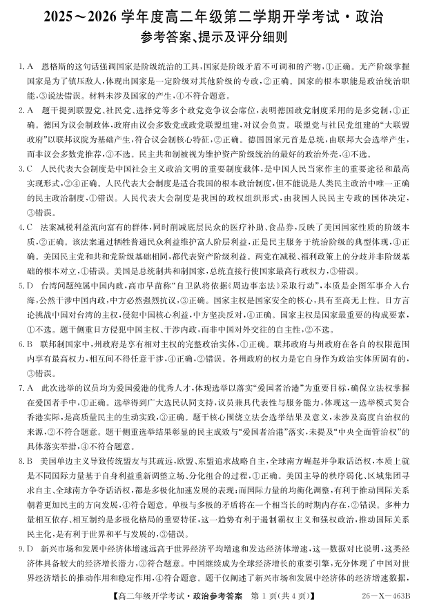 高二政治答案--黑龙江省龙东十校联盟2025-2026学年高二开学考试