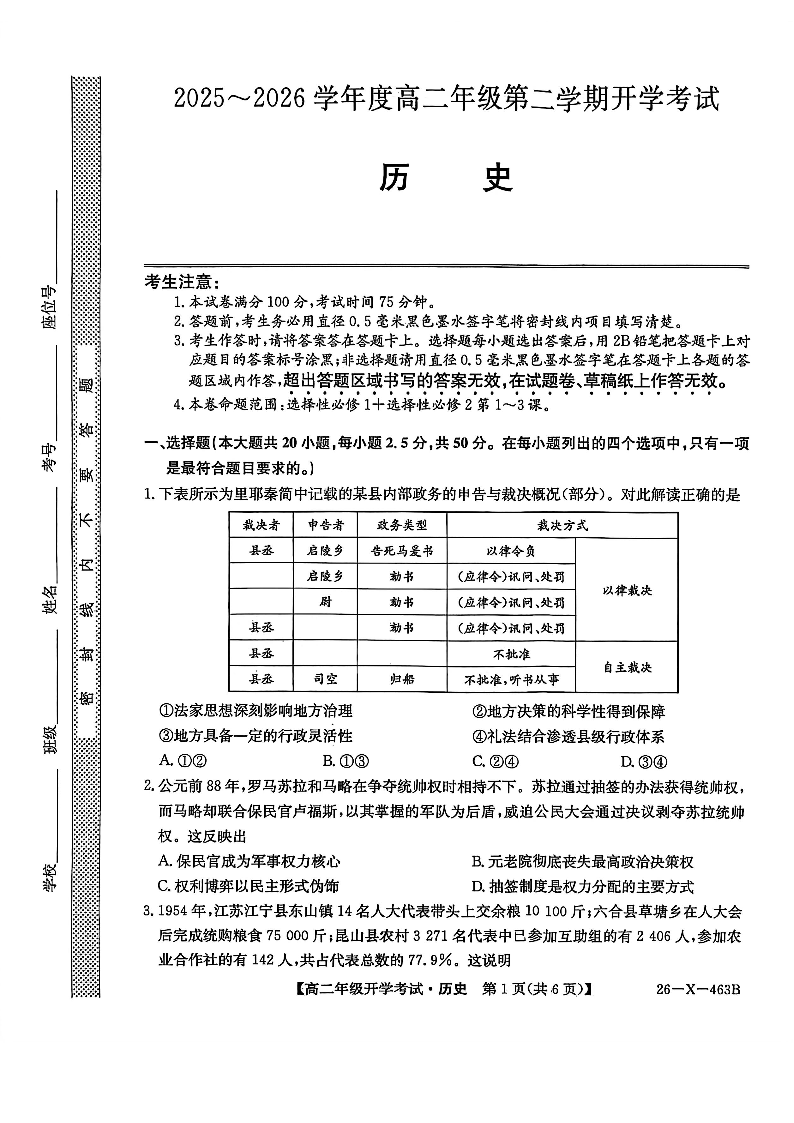 高二历史--黑龙江省龙东十校联盟2025-2026学年高二开学考试