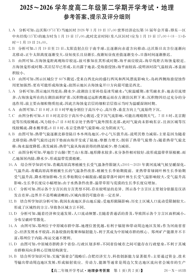 高二地理答案--黑龙江省龙东十校联盟2025-2026学年高二开学考试