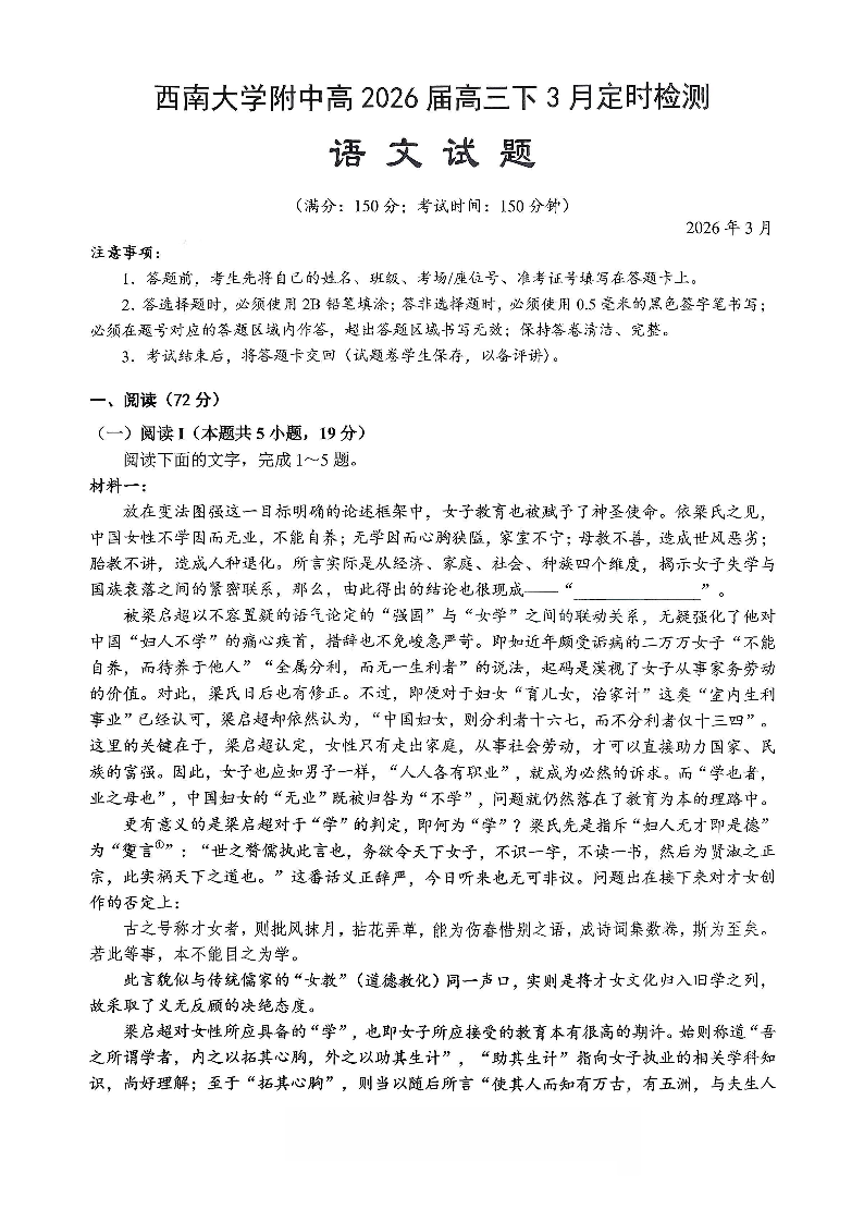 高三语文--重庆市西南大学附属中学2026届高三下学期3月入学考试