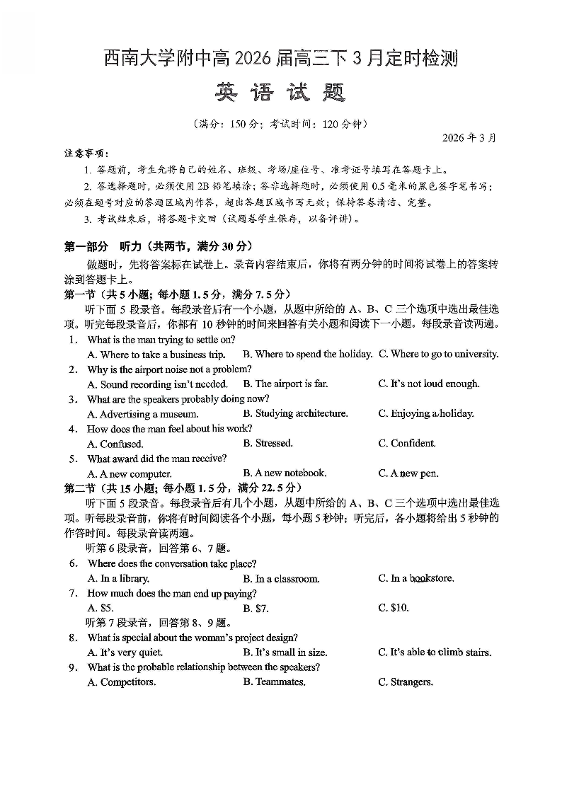 高三英语--重庆市西南大学附属中学2026届高三下学期3月入学考试