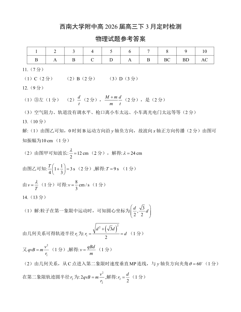 高三物理答案--重庆市西南大学附属中学2026届高三下学期3月入学考试