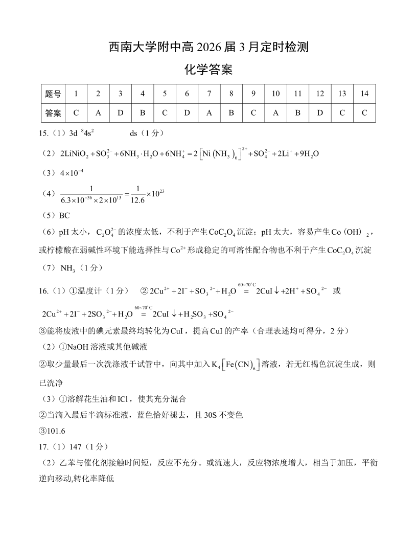 高三化学答案--重庆市西南大学附属中学2026届高三下学期3月入学考试