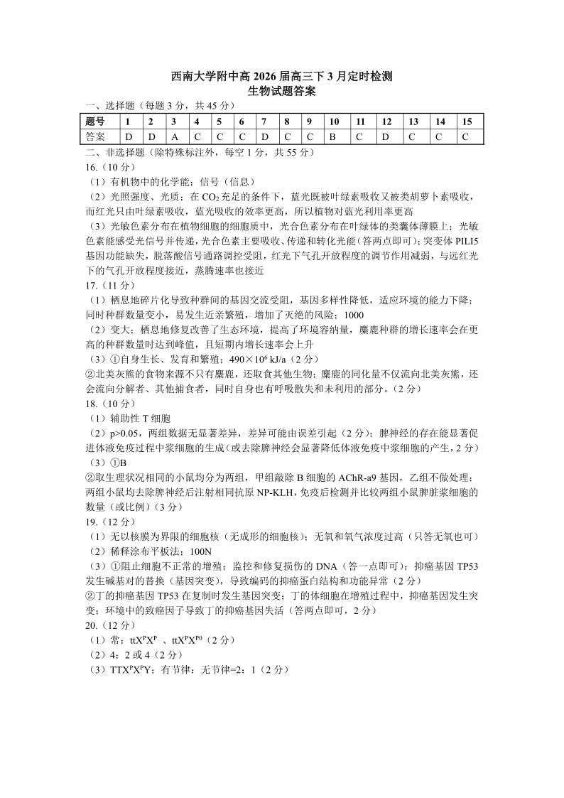 高三生物答案--重庆市西南大学附属中学2026届高三下学期3月入学考试