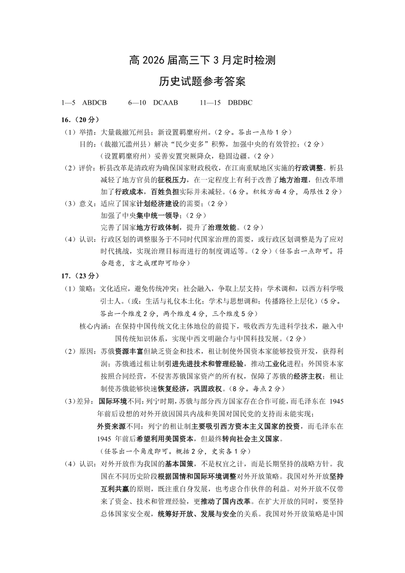 高三历史答案--重庆市西南大学附属中学2026届高三下学期3月入学考试