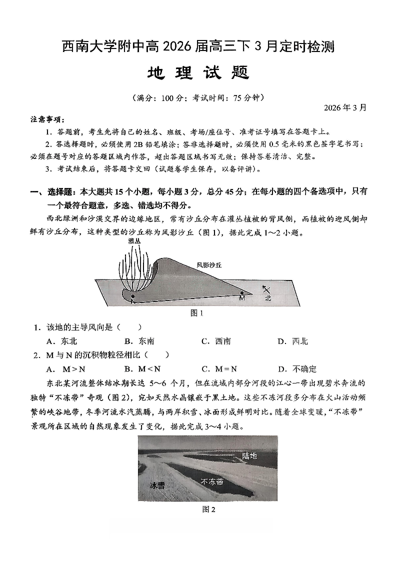 高三地理--重庆市西南大学附属中学2026届高三下学期3月入学考试
