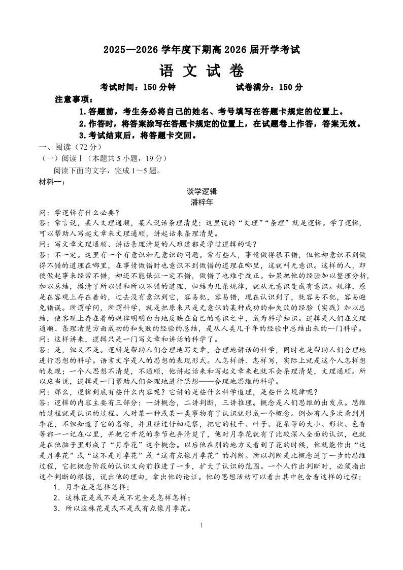 高三语文--四川省成都市第七中学2026届高三下期高开学考试