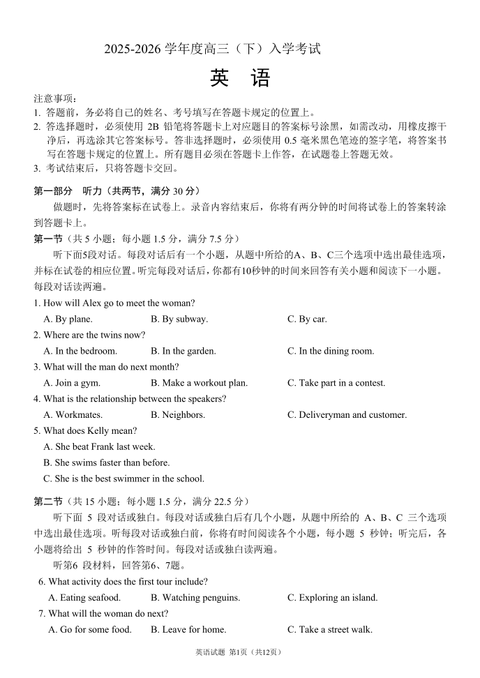 高三英语--四川省成都市第七中学2026届高三下期高开学考试